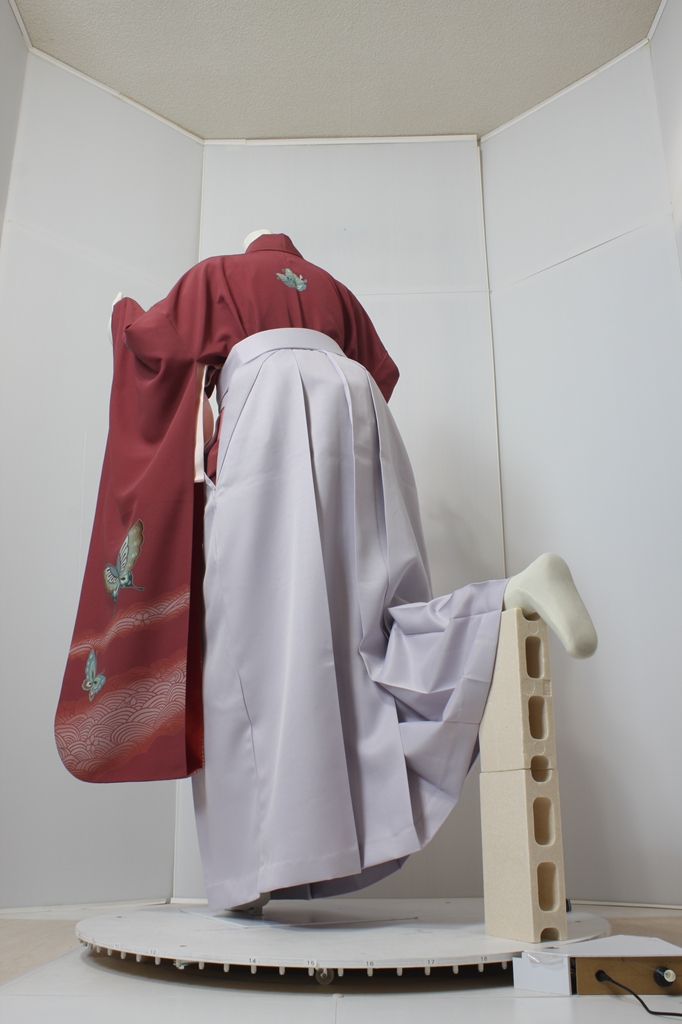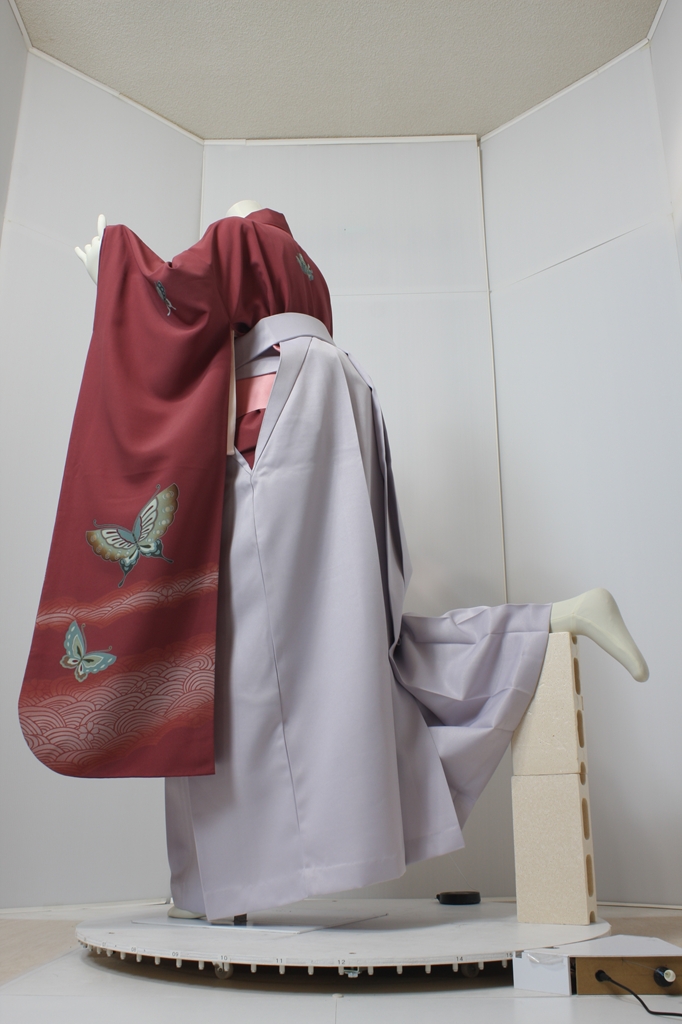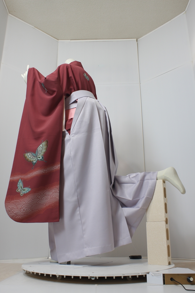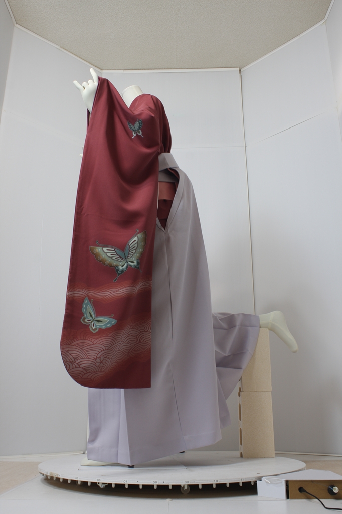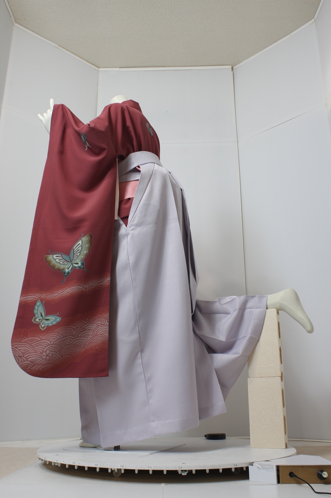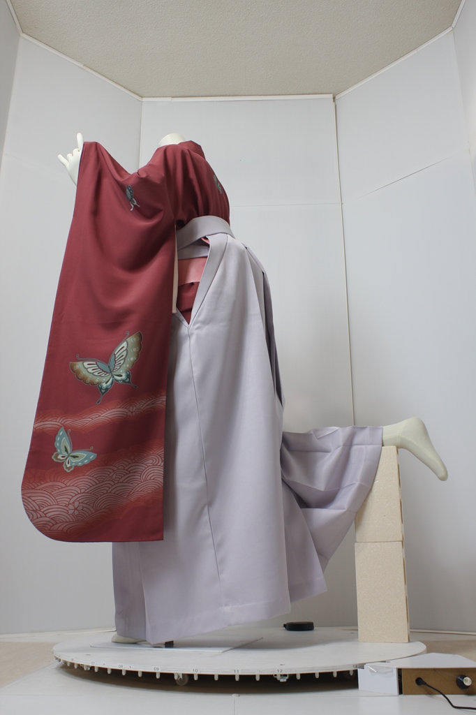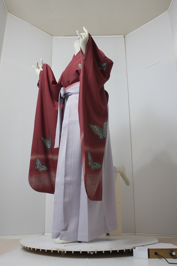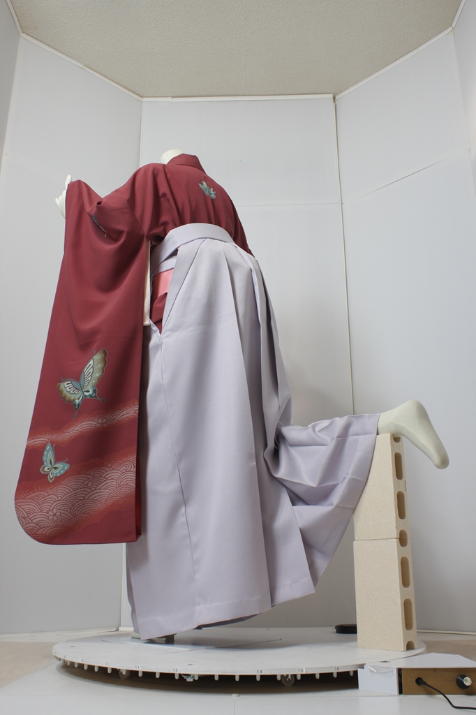 行燈袴回転ポーズand03は、両袖をつまんで、片脚を後ろに上げたおちゃめなポーズです。行燈袴と大振袖を組み合わせています。