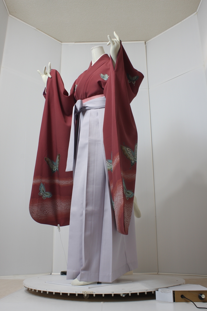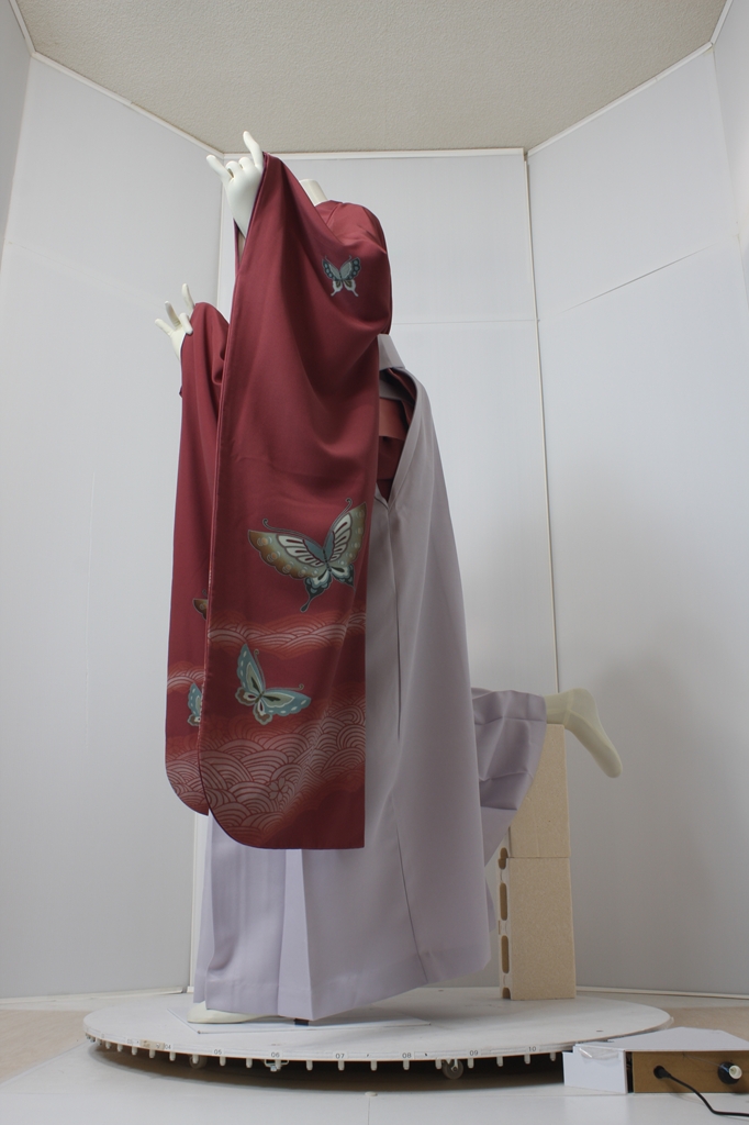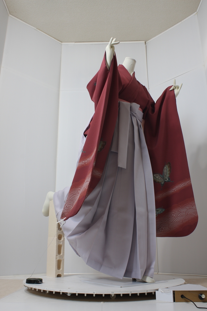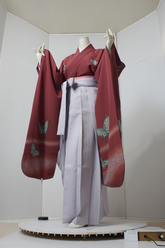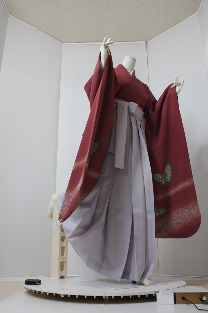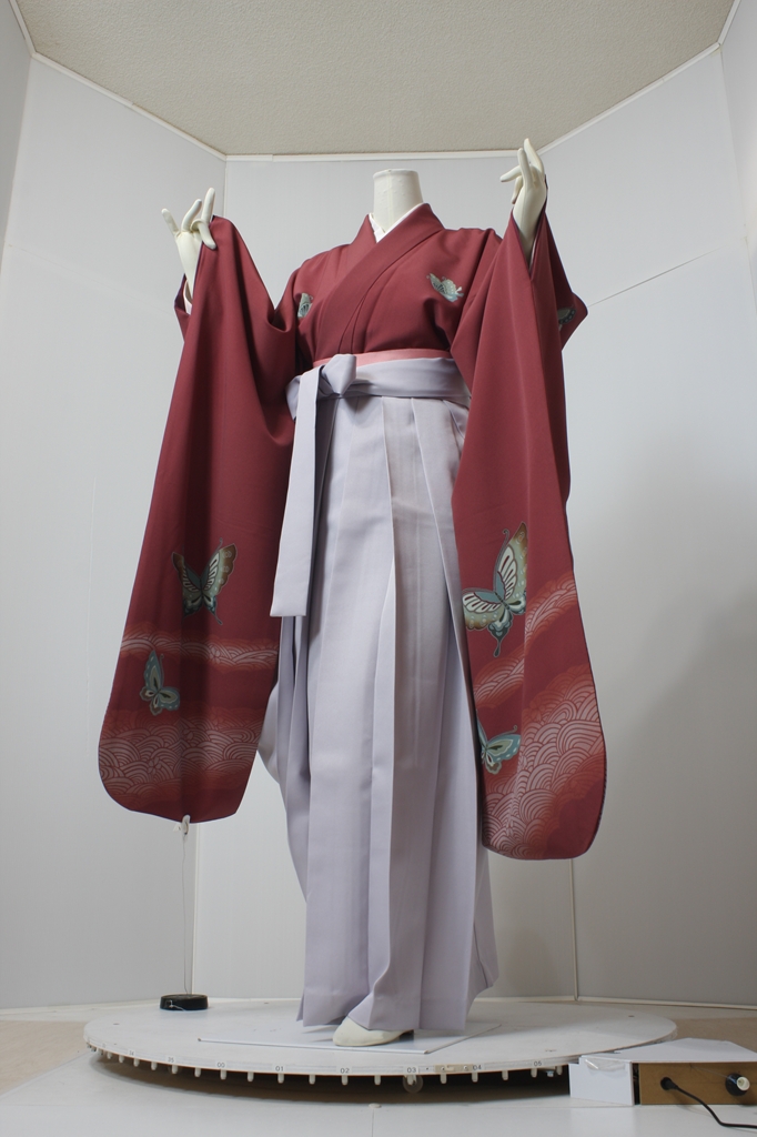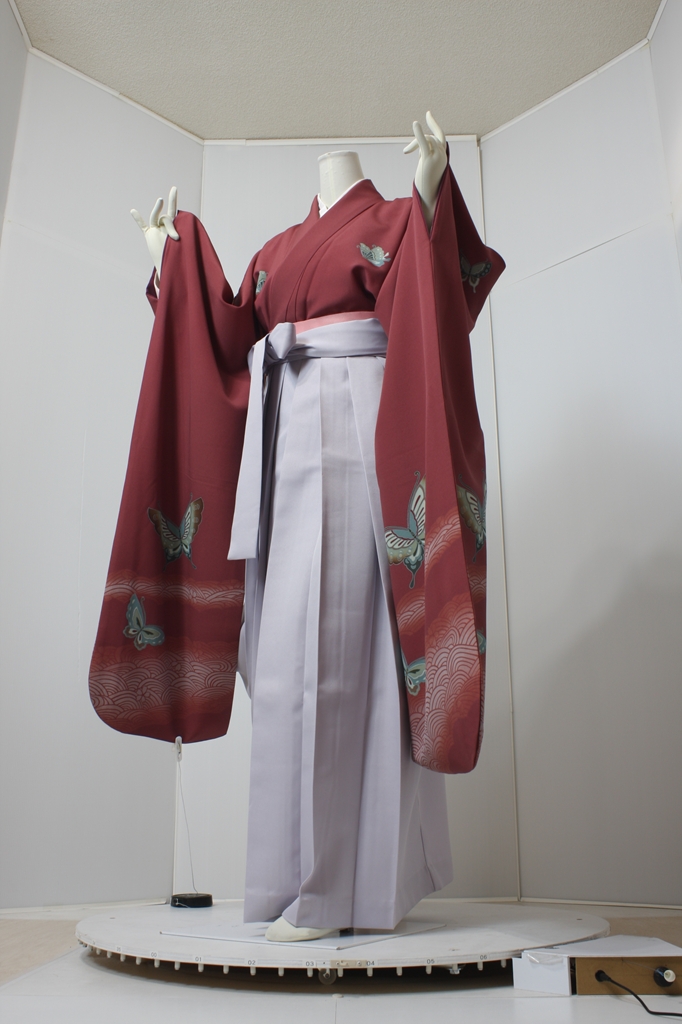 行燈袴回転ポーズand03は、両袖をつまんで、片脚を後ろに上げたおちゃめなポーズです。行燈袴と大振袖を組み合わせています。