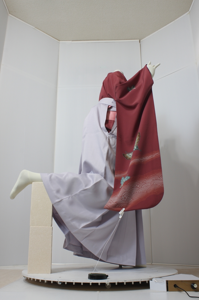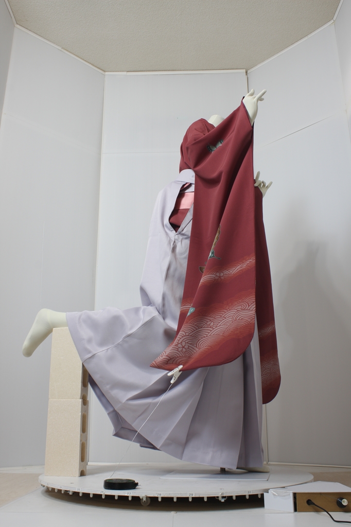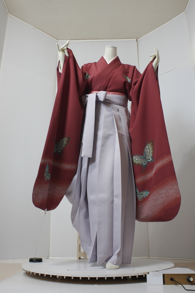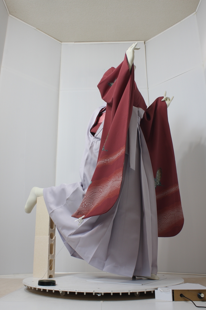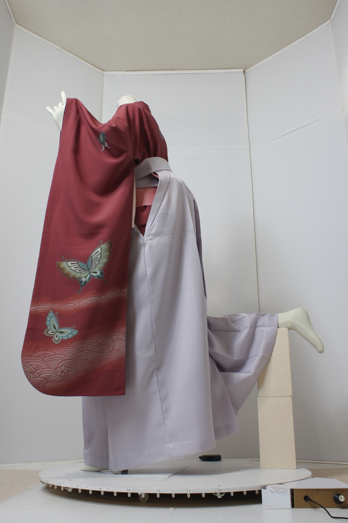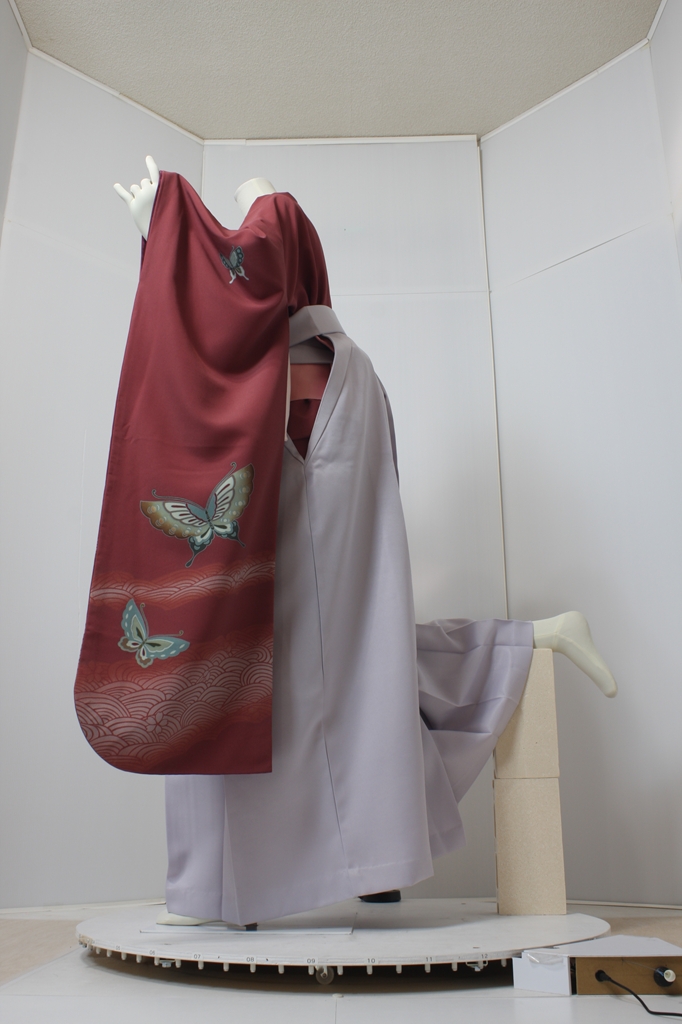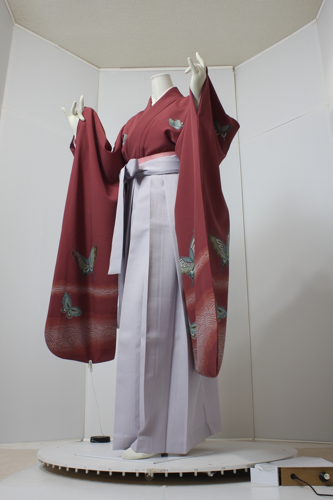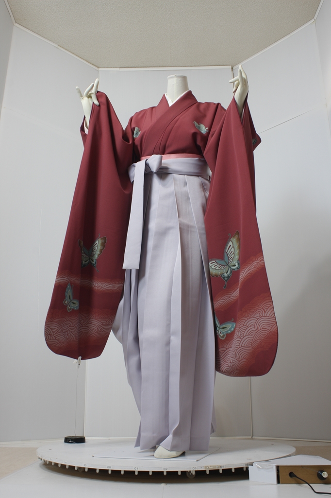 行燈袴回転ポーズand03は、両袖をつまんで、片脚を後ろに上げたおちゃめなポーズです。行燈袴と大振袖を組み合わせています。